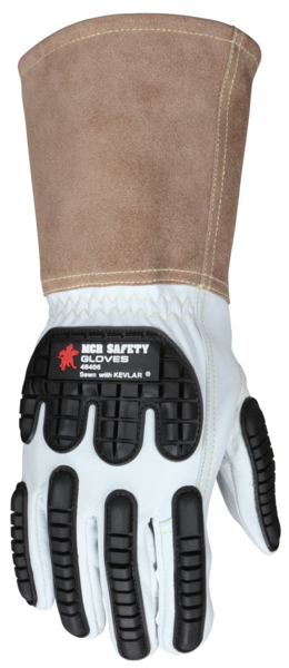 The 48406 welding gloves from MCR Safety are made of premium grain goatskin that is naturally soft due to their natural lanolin content. The supple leather offers excellent tactile sensitivity and tensile strength. These gloves are an unlined Mig/Tig option with a 5-inch russet split cowskin cuff for added safety. They feature a keystone thumb design and a self-hem sewn cuff and are sewn with DuPont™ Kevlar® for durability. The TPR back offers excellent impact resistance on the fingers and back of the hand. The 48406 provides a comfortable and flexible fit that makes it easy to wear. If you are looking for the best impact-resistant welding gloves, look no further than MCR Safety!