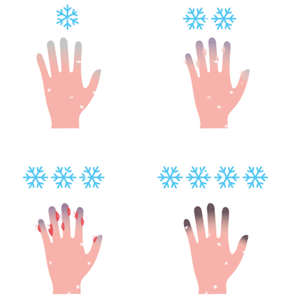 The skin on sensitive areas such as fingers, toes, ears, noses, and lips may turn black from lack of blood flow.