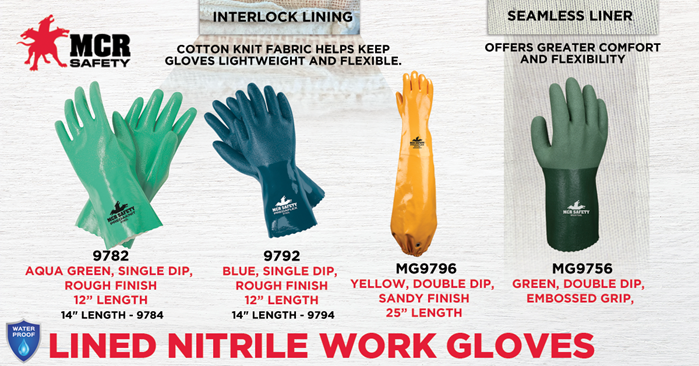 When you are working around oils or prefer a glove with a little more ruggedness, nitrile waterproof gloves are your go-to option. The two images below showcase our lined and unlined nitrile waterproof gloves.