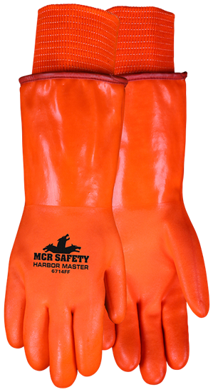 MCR Safety's best waterproof winter glove for keeping water out and the heat in is the 6714FF, a double-dipped, PVC-coated, insulated work glove lined with polar fleece and foam. The 14-inch length and an inner knit wrist provide increased protection. The sandy textured finish and high-visibility orange PVC coating help keep your hands safe and seen.