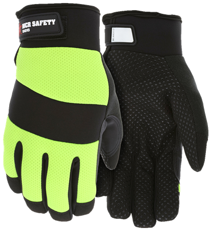 MCR Safety's 926 gloves are equipped with a 40-gram Thermosock® lining and a waterproof/windproof bladder, plus a synthetic leather palm with silicone dots. This glove will give you the grip, durability, and protection you need for jobs in wet and cold conditions. The 926 glove also features a black terry cloth thumb, black neoprene knuckle strap, and hook and loop wrist closure. Other features include a hi-vis green fabric back.