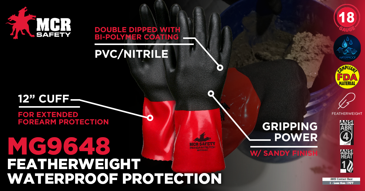 The thinnest waterproof glove in our product lineup is the MG9648. Comfortable and easy to wear, the PredaStretch™ MG9648 features a PVC/nitrile bi-polymer double-dip, providing excellent dexterity and grip for even the slickest of fish. The 12-inch gauntlet cuff offers extended protection, too.